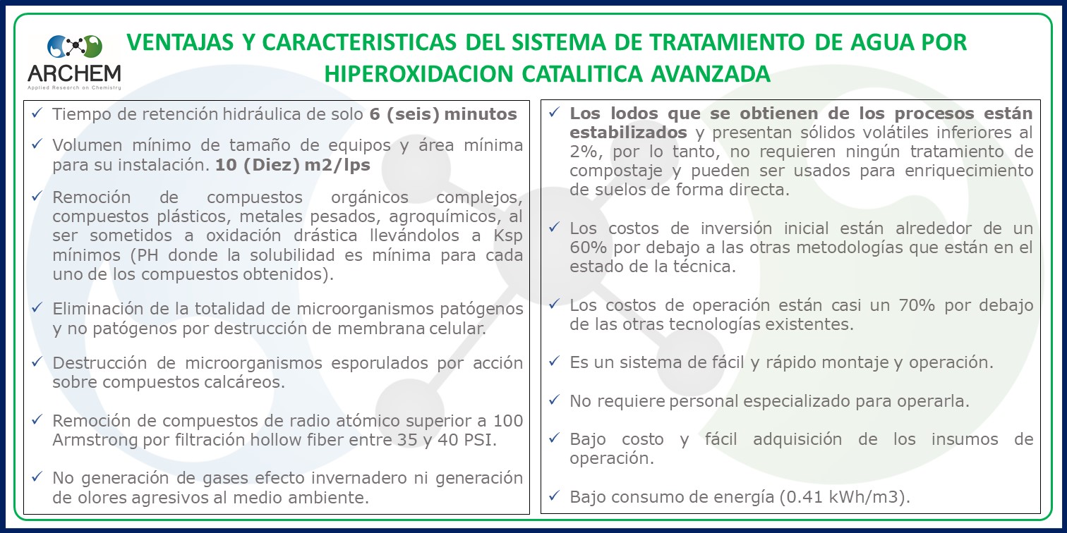 La tecnología de oxidación avanzada comúnmente conocida como Hiperoxidación Catalítica Avanzada es un desarrollo concebido para llevar al máximo la eficiencia de los procesos de potabilización y tratamiento de aguas residuales de todo tipo (municipales, domésticas, industriales, lixiviados, vinazas y muchas otras más). Este proceso puede ser usado para tratar todos los residuos líquidos de los cuales se desee recuperar el recurso AGUA. En la hiperoxidación catalítica avanzada confluyen los conocimientos en la aplicación de catálisis bioquímica, diseño de proceso y la implementación de estrategias de mejora continua.
